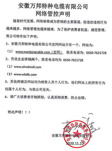 鄭重聲明:安徽萬邦特種電纜有限公司官方網站為:www_wanbangcable_com.csgocs.com,除此之外無任何子網站或合作網站,其余均為假冒偽劣。電話:0550-7621728 13485756353 地 址:安徽省天長市滁州高新技術產業開發區經四路29號